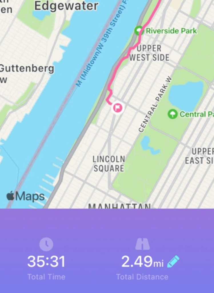 I ALMOST CLEARED THREE MILES!!!! And I know that next time I can. I have discovered as I do this, I don’t like running in a loop. This app is great about telling you when you’re at the halfway point, and in previous runs, I will have turned around at that point and then done a circuit, but I’ve never really liked that. I like running toward something, not back to where I started. And the amazing thing about living in NYC is that I can hop on the subway to bring me home. Which is exactly what I did today and what I will likely do a lot more of moving forward.